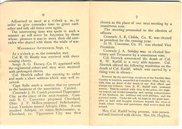 Page 6-7 12th Ohio Volunteer Cavalry Reunion Booklet 1888 Back to Main Page Copyright © 2001 Larry Stevens - Brent Nimmo - Clair McCullough